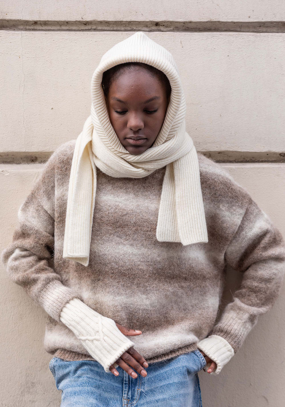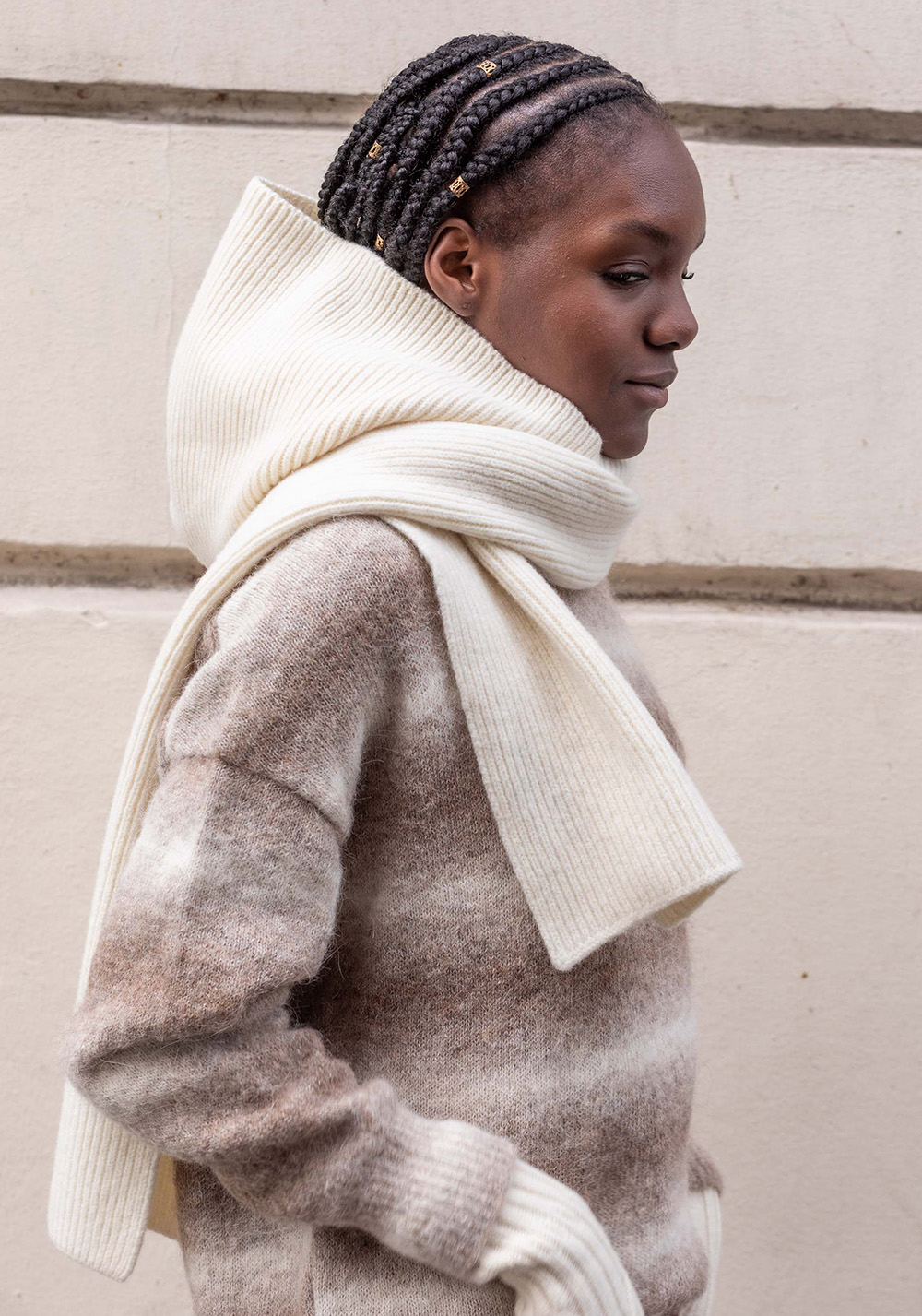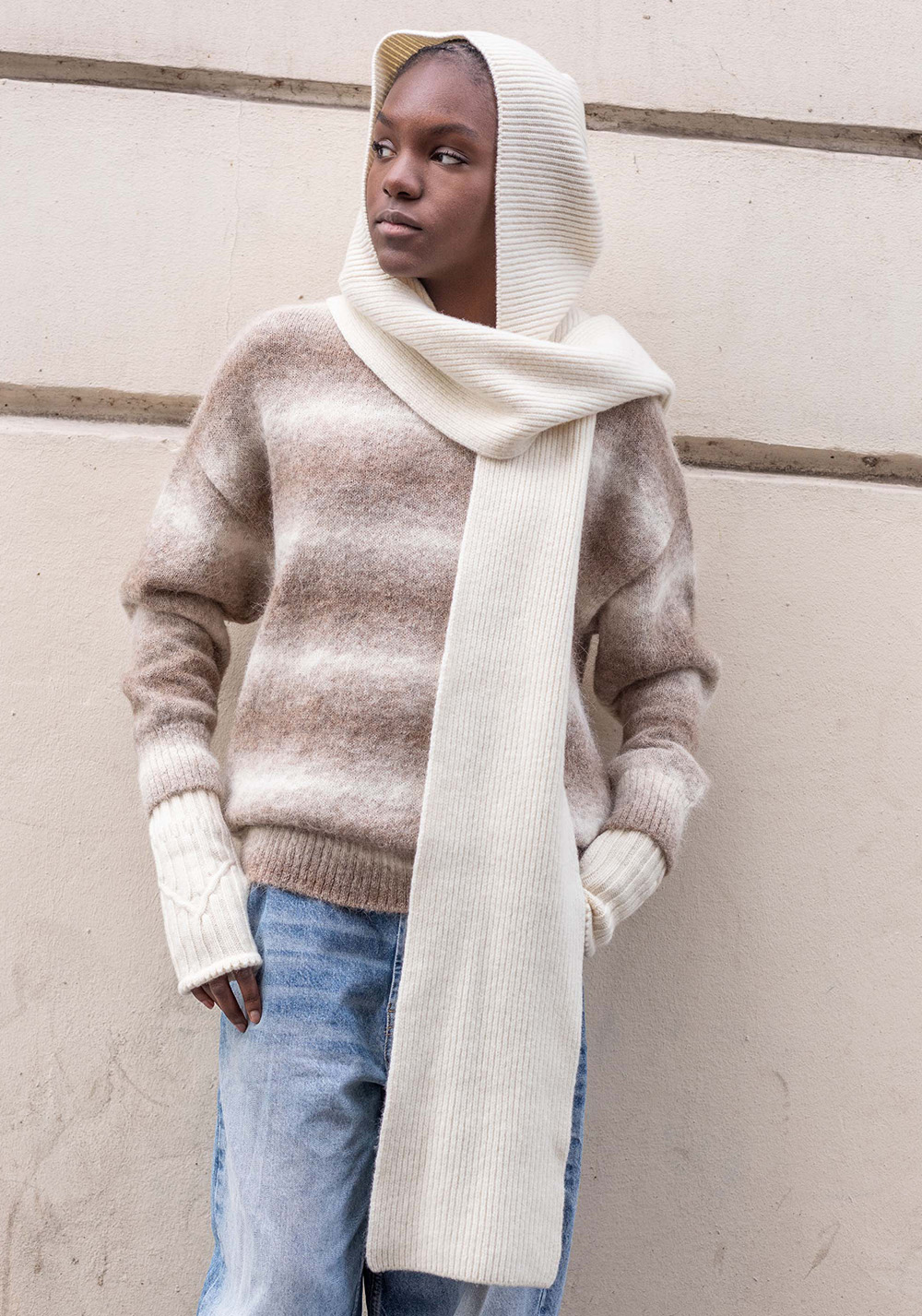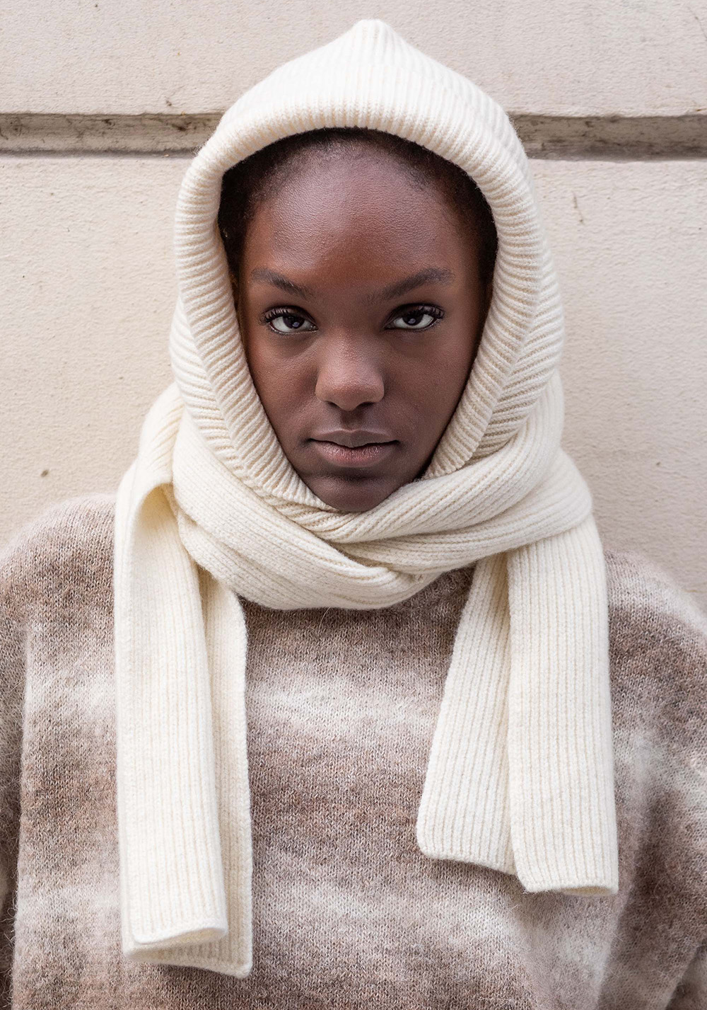 L’écharpe capuche " LES INSÉPARABLES " a été tricoté sur des machines Shima dans l’atelier de la famille Raji à Casablanca.
