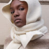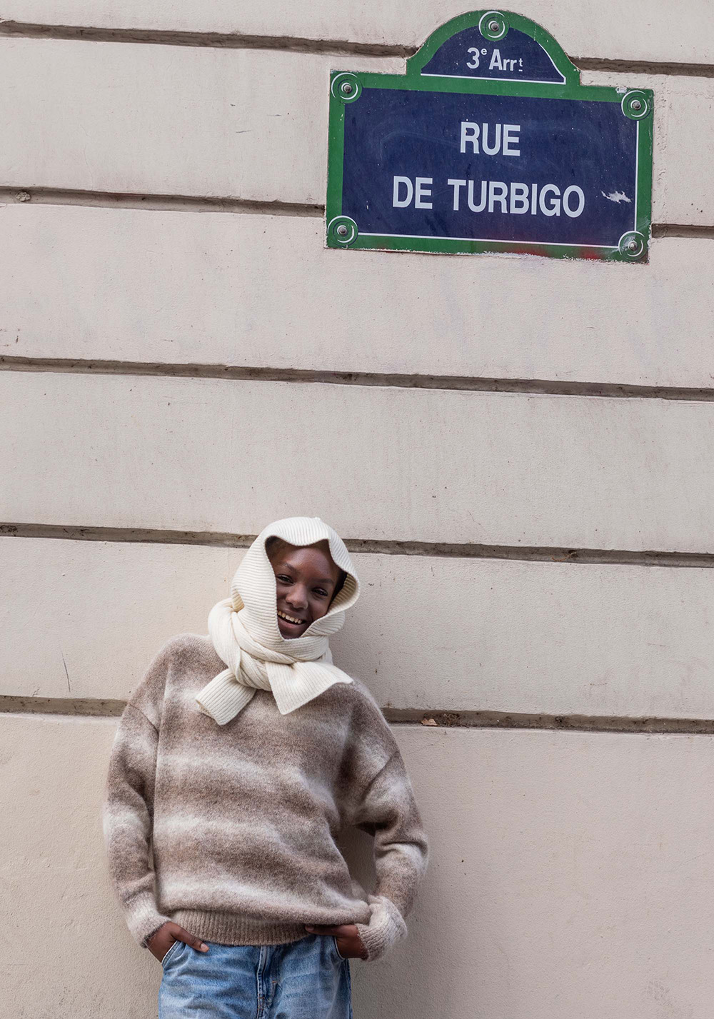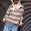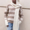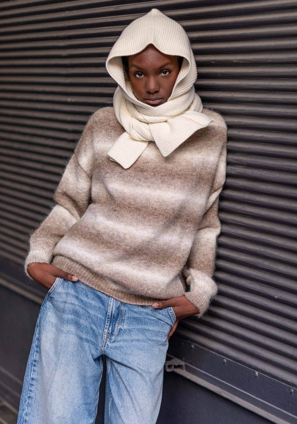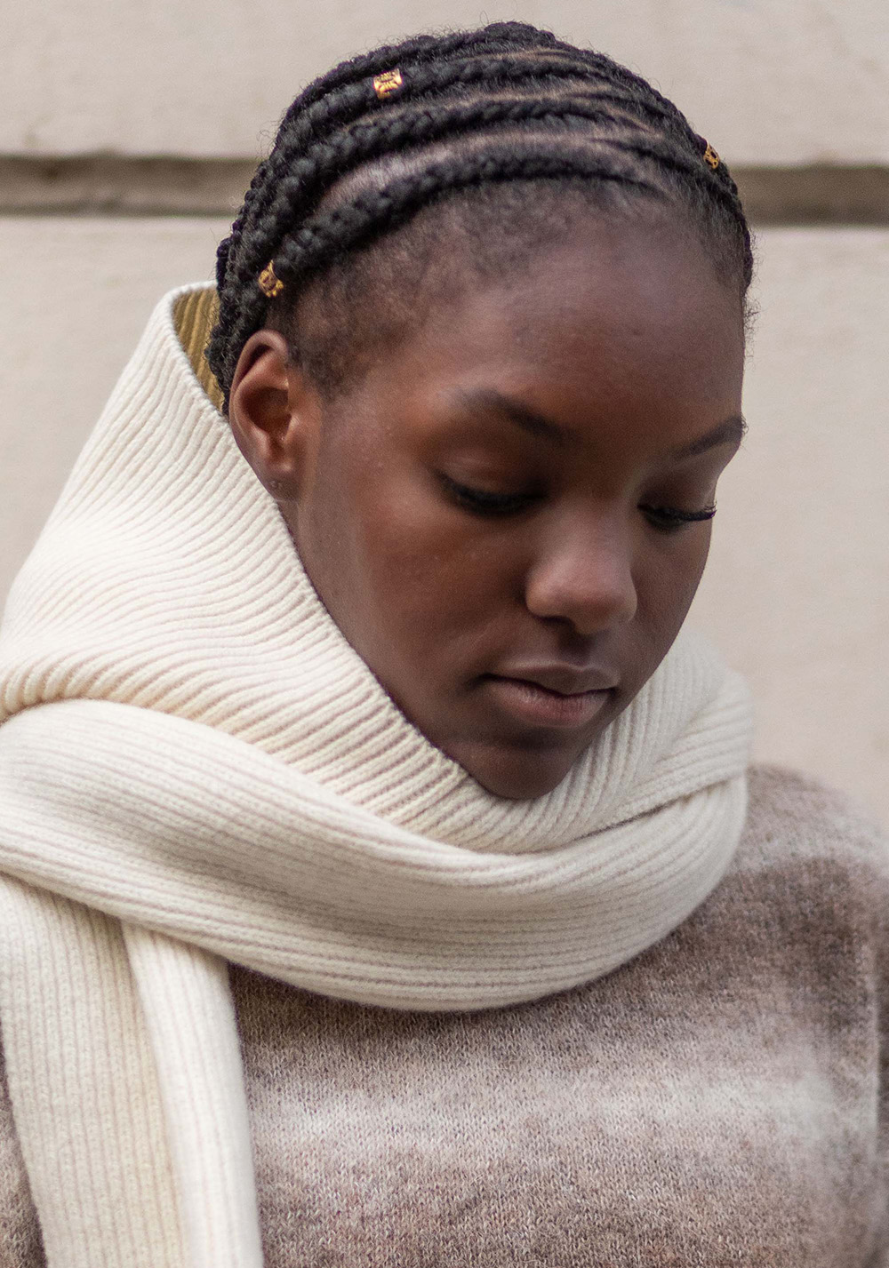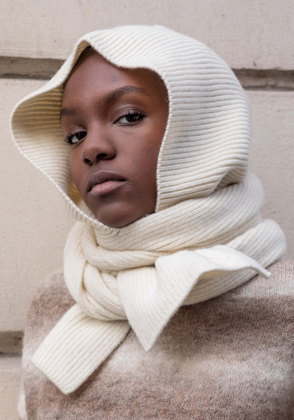 L’écharpe capuche " LES INSÉPARABLES " a été tricoté sur des machines Shima dans l’atelier de la famille Raji à Casablanca.