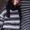 L’écharpe capuche " LES INSÉPARABLES " a été tricoté sur des machines Shima dans l’atelier de la famille Raji à Casablanca.