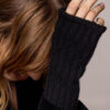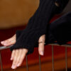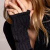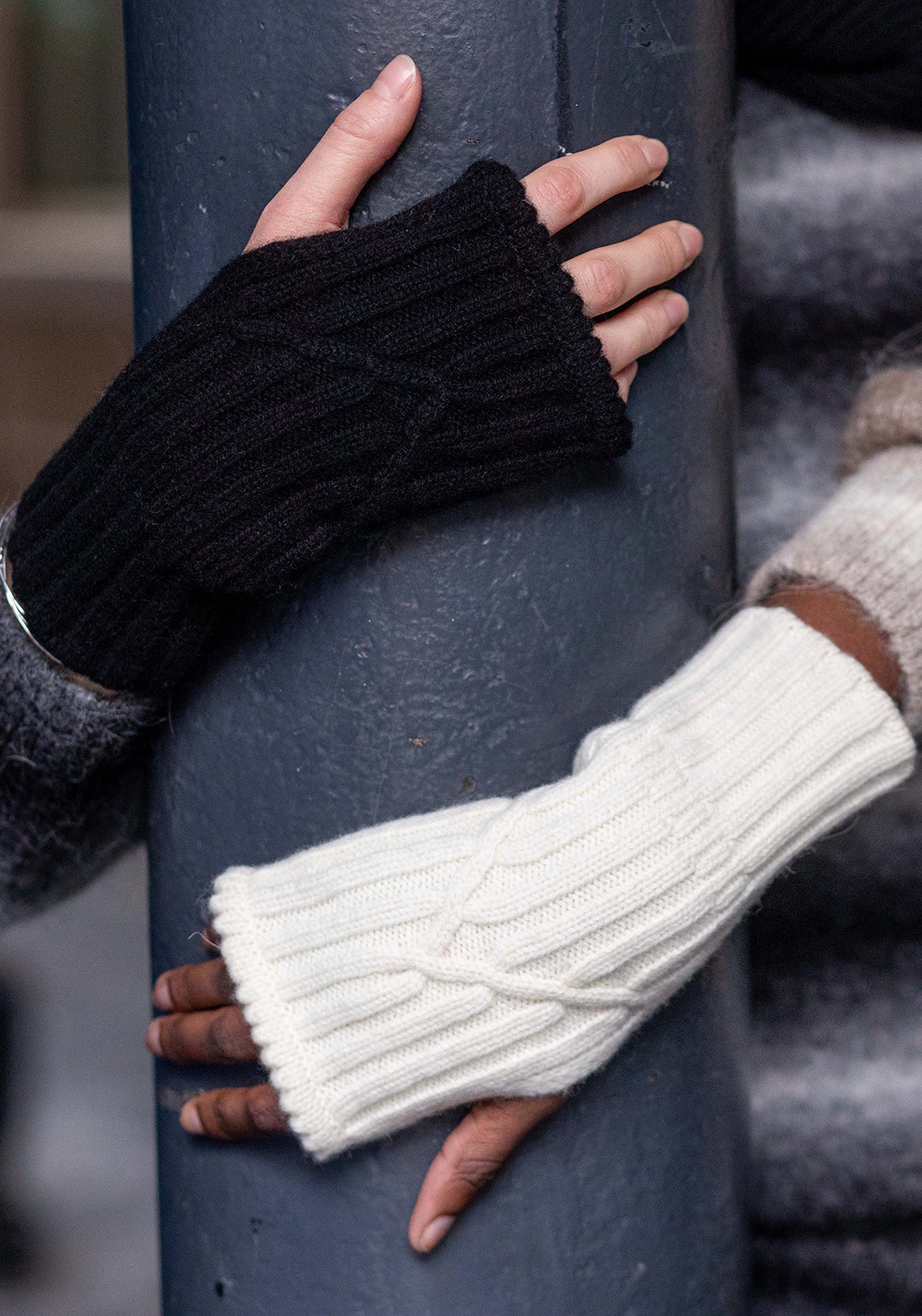 " MAIN DANS LA MAIN ", mitaines tricotées en 100% laine Mérinos recyclée. Les côtes entrelacées qui les décorent se poursuivent généreusement sur les poignets couvrant ainsi le petit « courant d’air » d’entre les manches et les mains.
