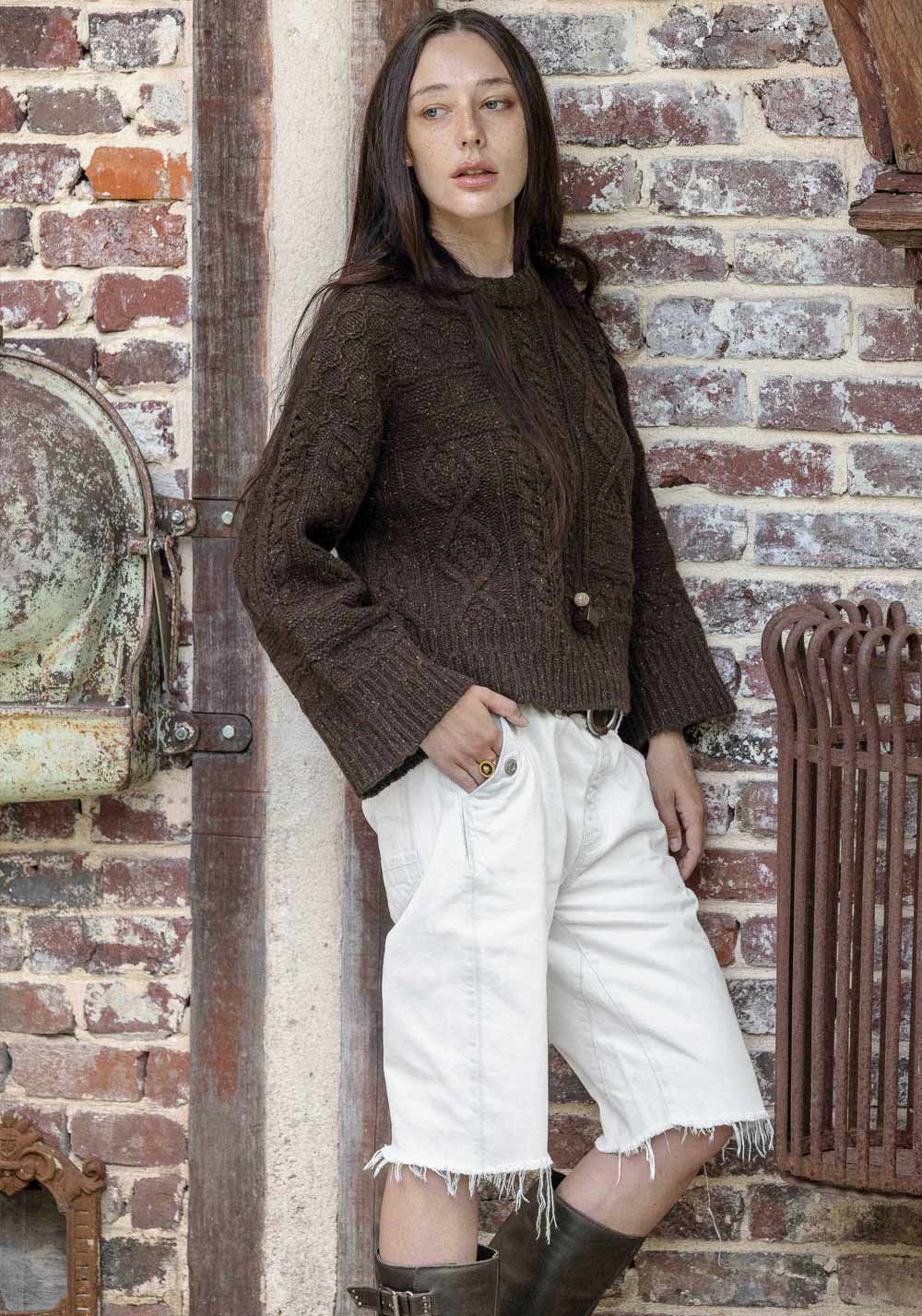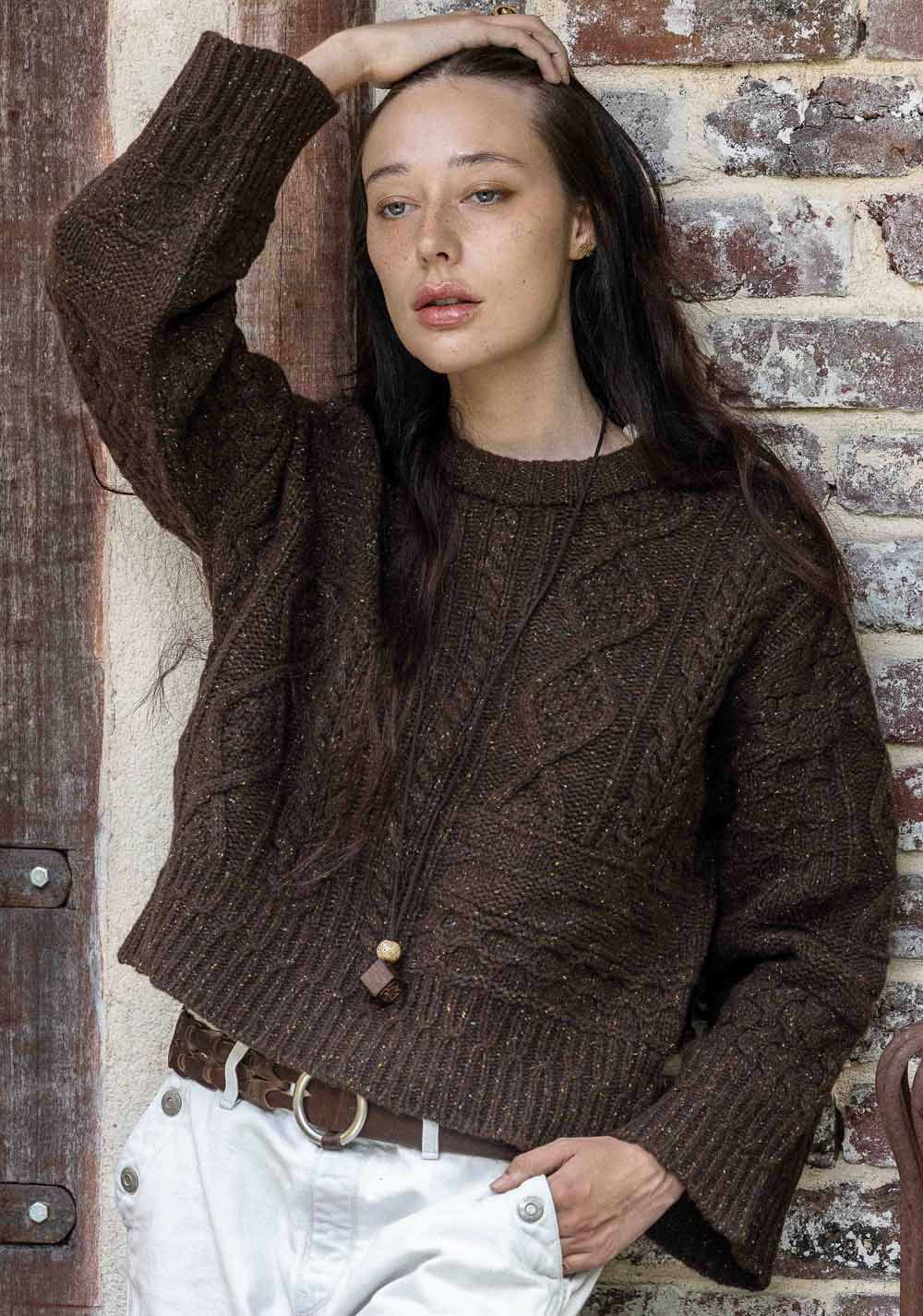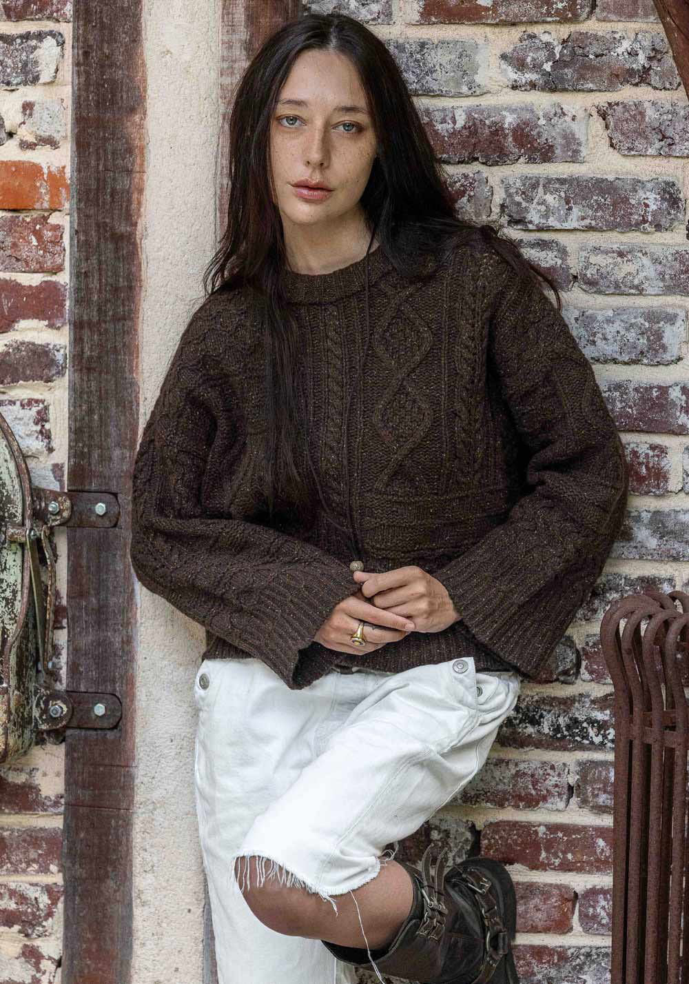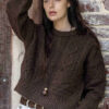 " PERGAME ", c’est la version déstructurée du pull irlandais… Sa forme, articulée autour de multiples torsades et de points fantaisies offre un tombé parfaitement équilibré entre longueur maîtrisée et manches pagodes, soulignées par leurs côtes 1/1 twistées.