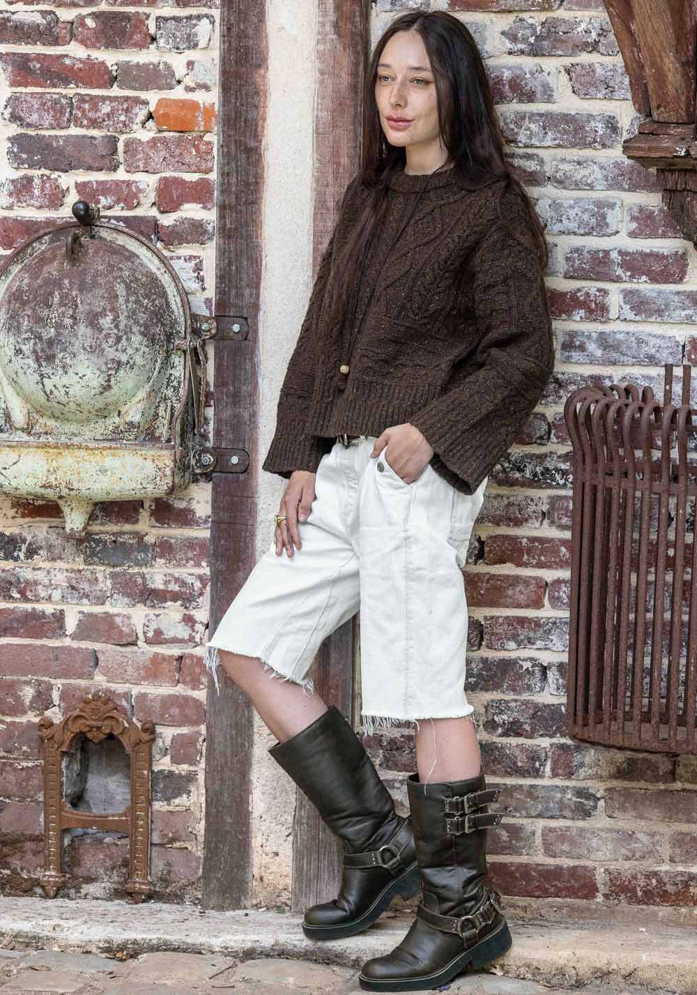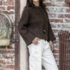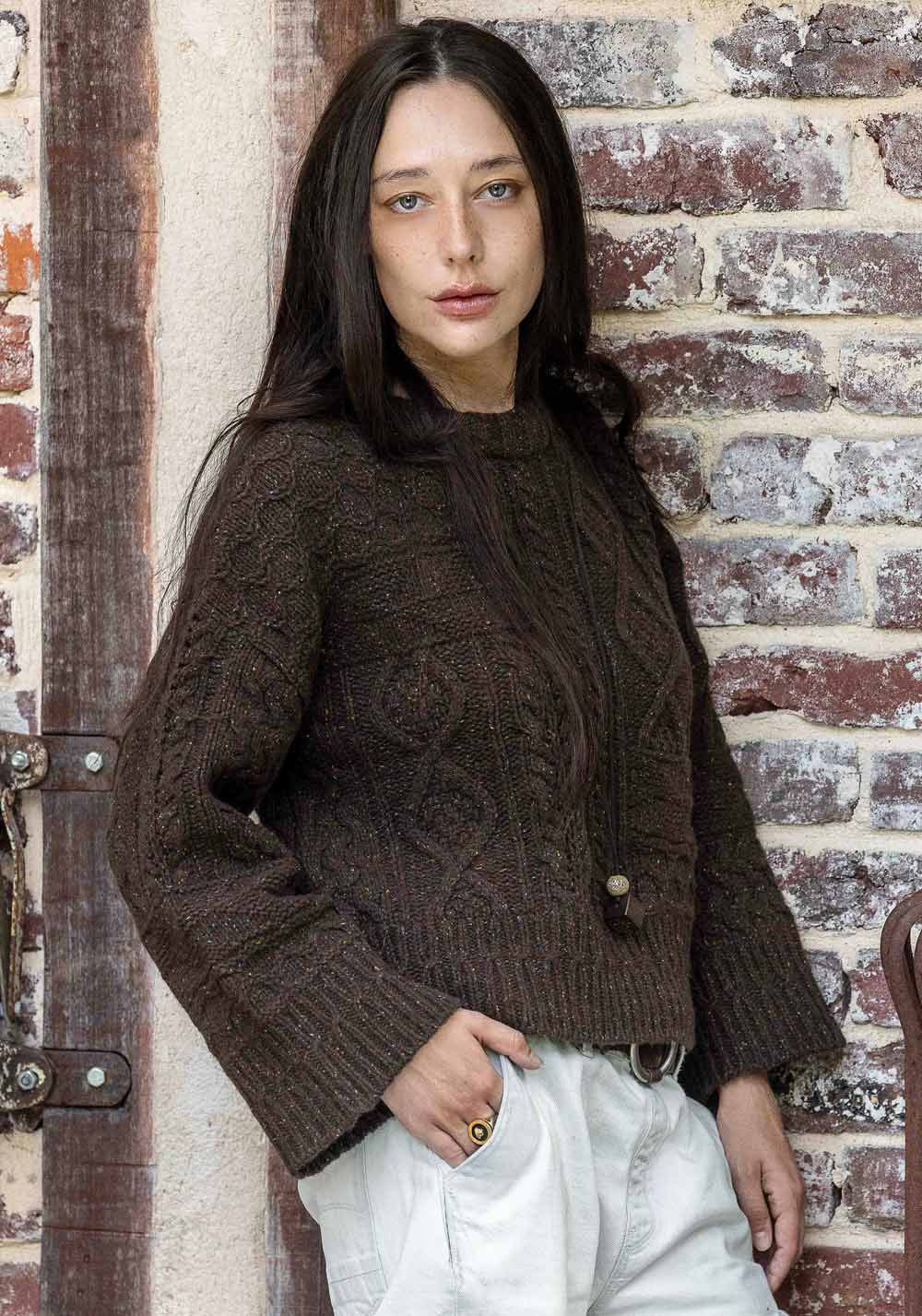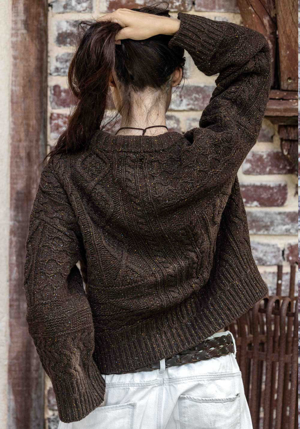 " PERGAME ", c’est la version déstructurée du pull irlandais… Sa forme, articulée autour de multiples torsades et de points fantaisies offre un tombé parfaitement équilibré entre longueur maîtrisée et manches pagodes, soulignées par leurs côtes 1/1 twistées.