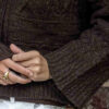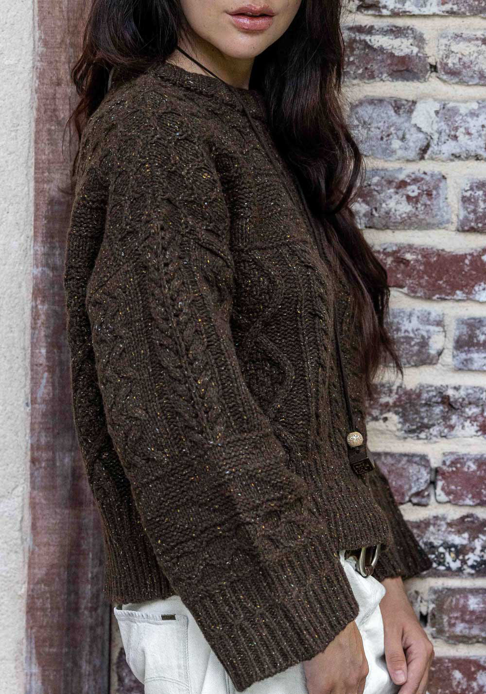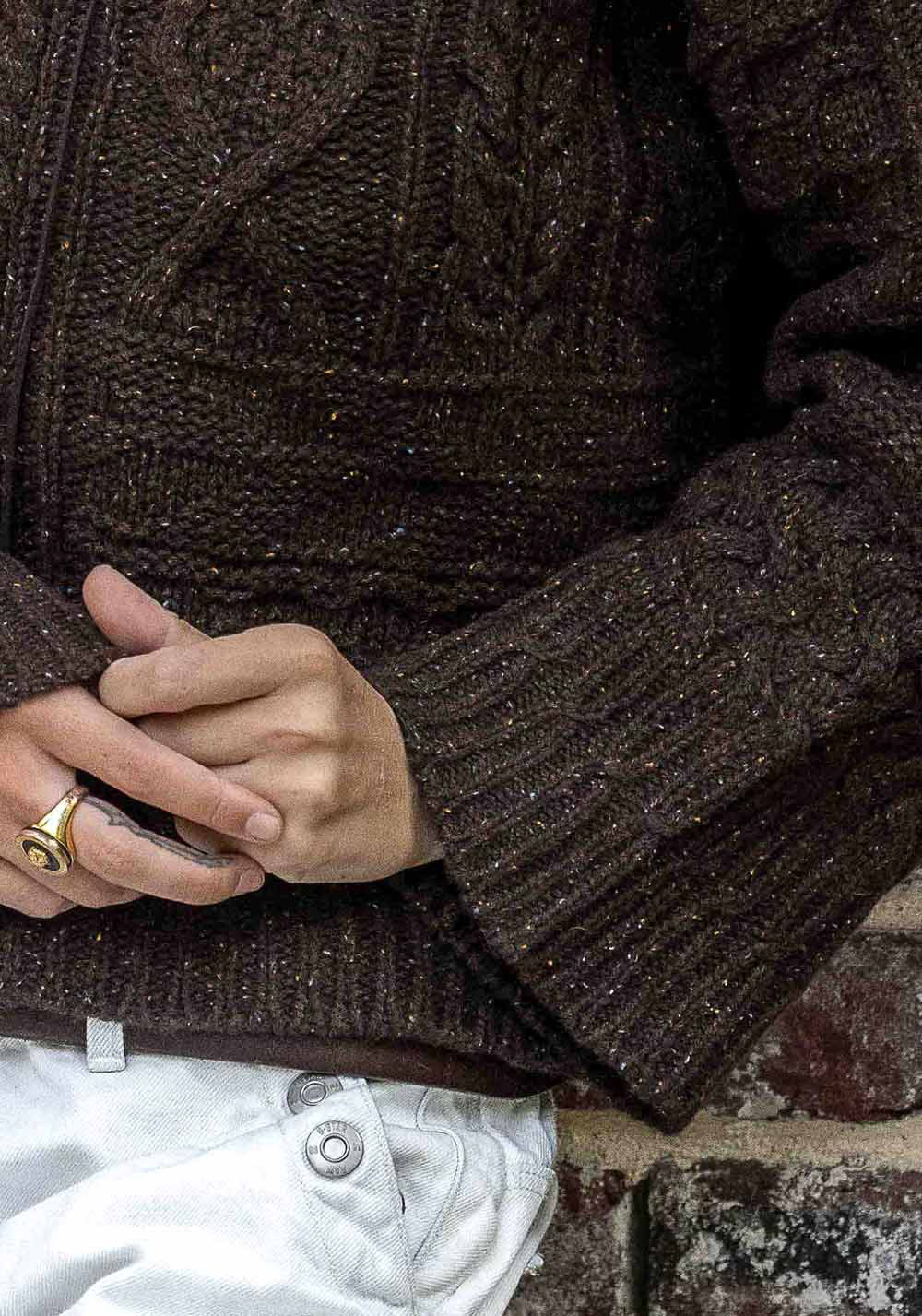 Le coloris marron tweedé, illuminé par de fines bourrettes de soie colorées, révèle toute sa richesse à la lumière.