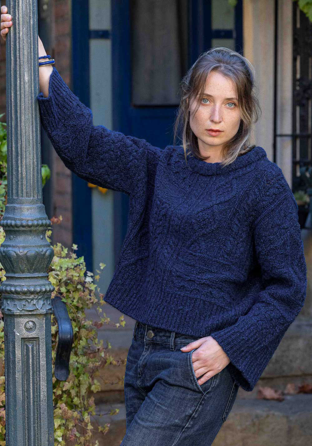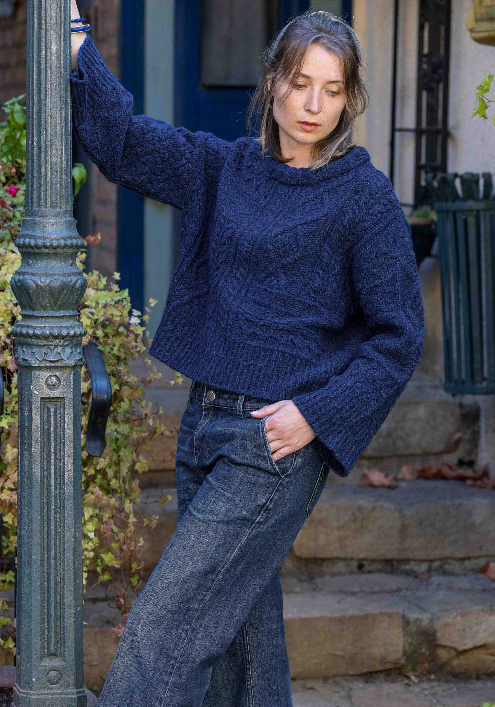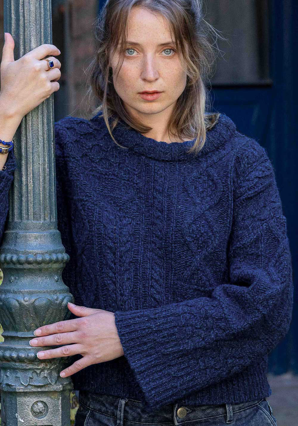 " PERGAME ", c’est la version déstructurée du pull irlandais… Sa forme, articulée autour de multiples torsades et de points fantaisies offre un tombé parfaitement équilibré entre longueur maîtrisée et manches pagodes, soulignées par leurs côtes 1/1 twistées.