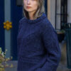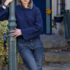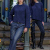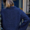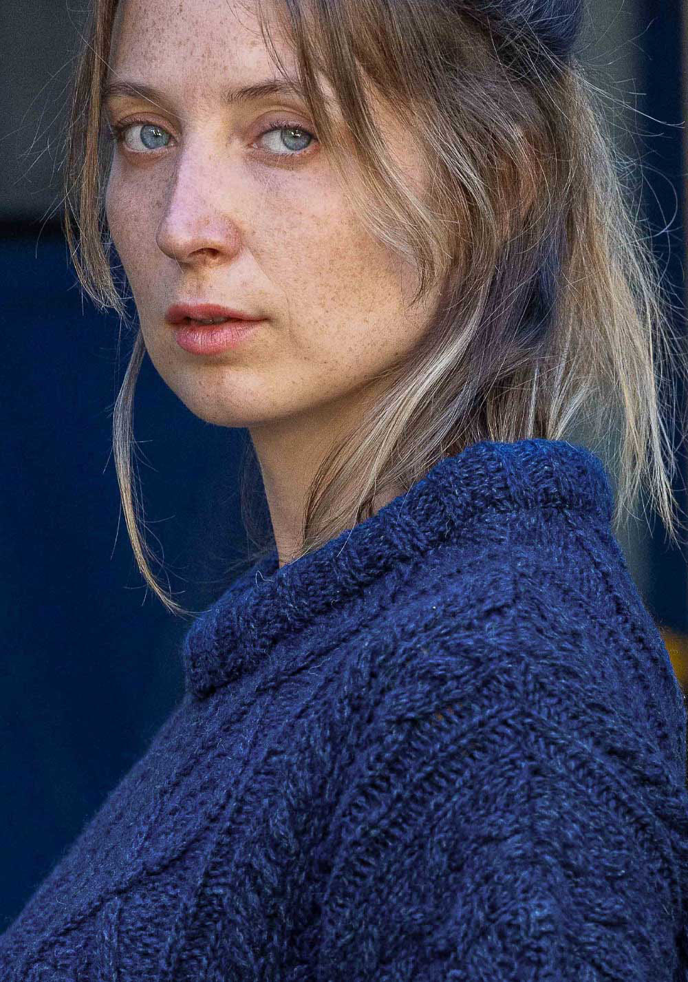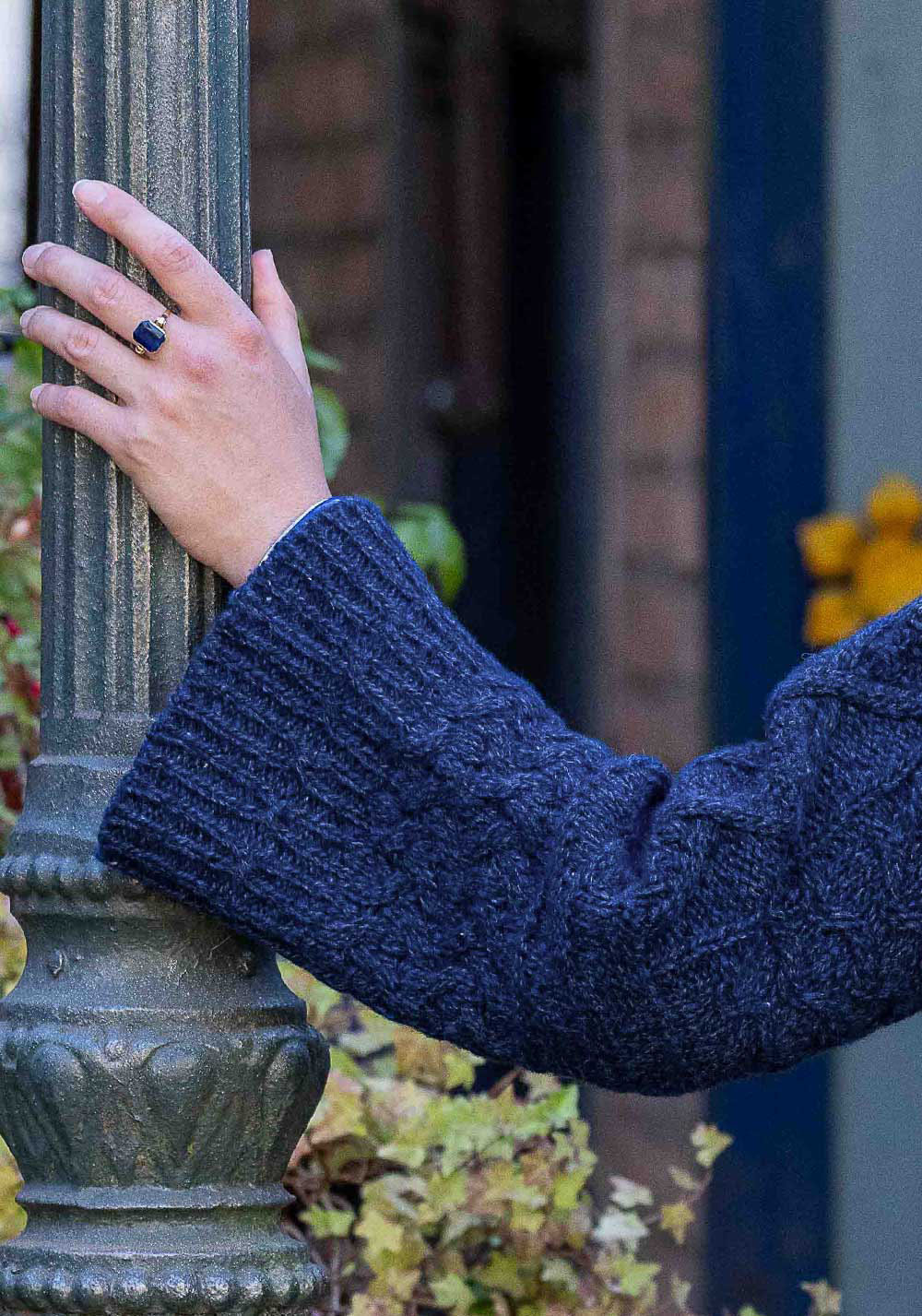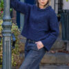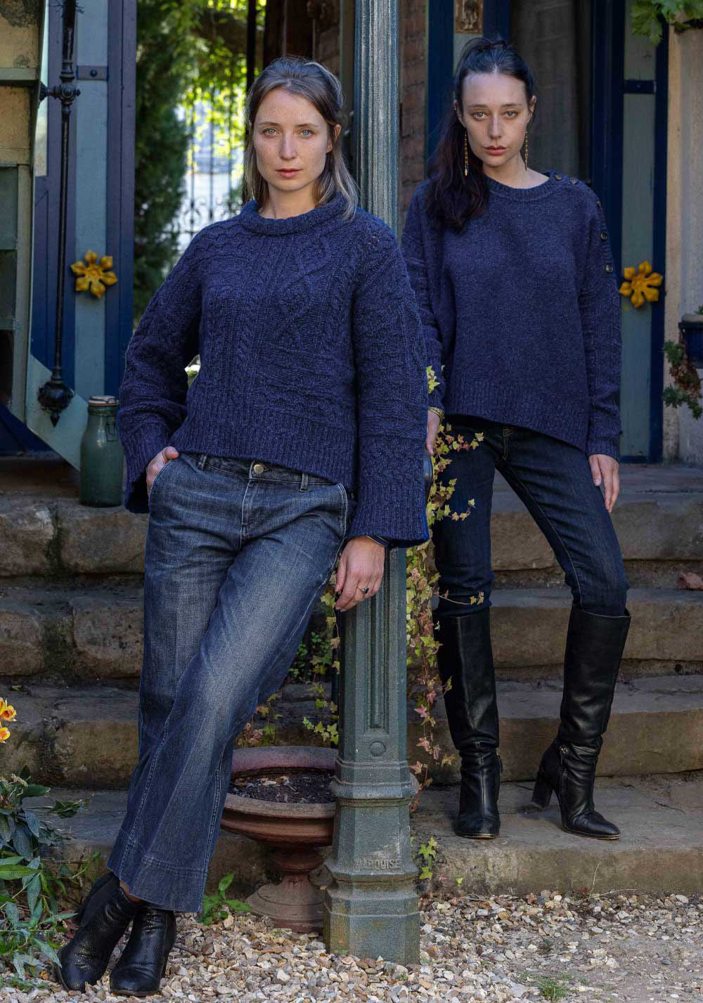 Le coloris bleu, est obtenu en moulinant trois bleus avant tricotage : nuit, mer et royal. La couleur ainsi obtenue est profonde, presque mouvante.