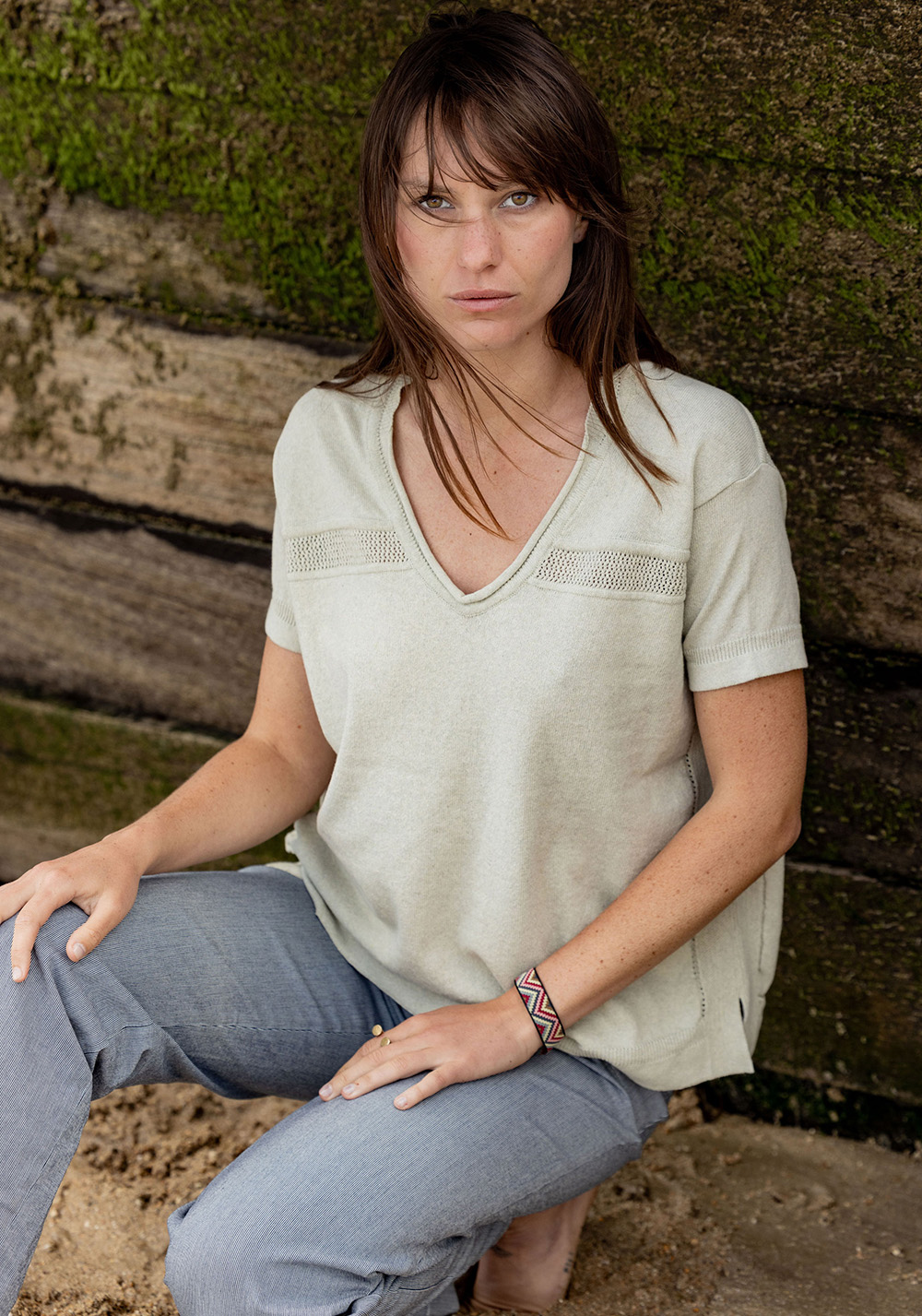 " POÉSIE " Manches courtes, col « V » arrondi, maille jersey fluide rythmée de jours échelle et de résille, fentes cotés.
