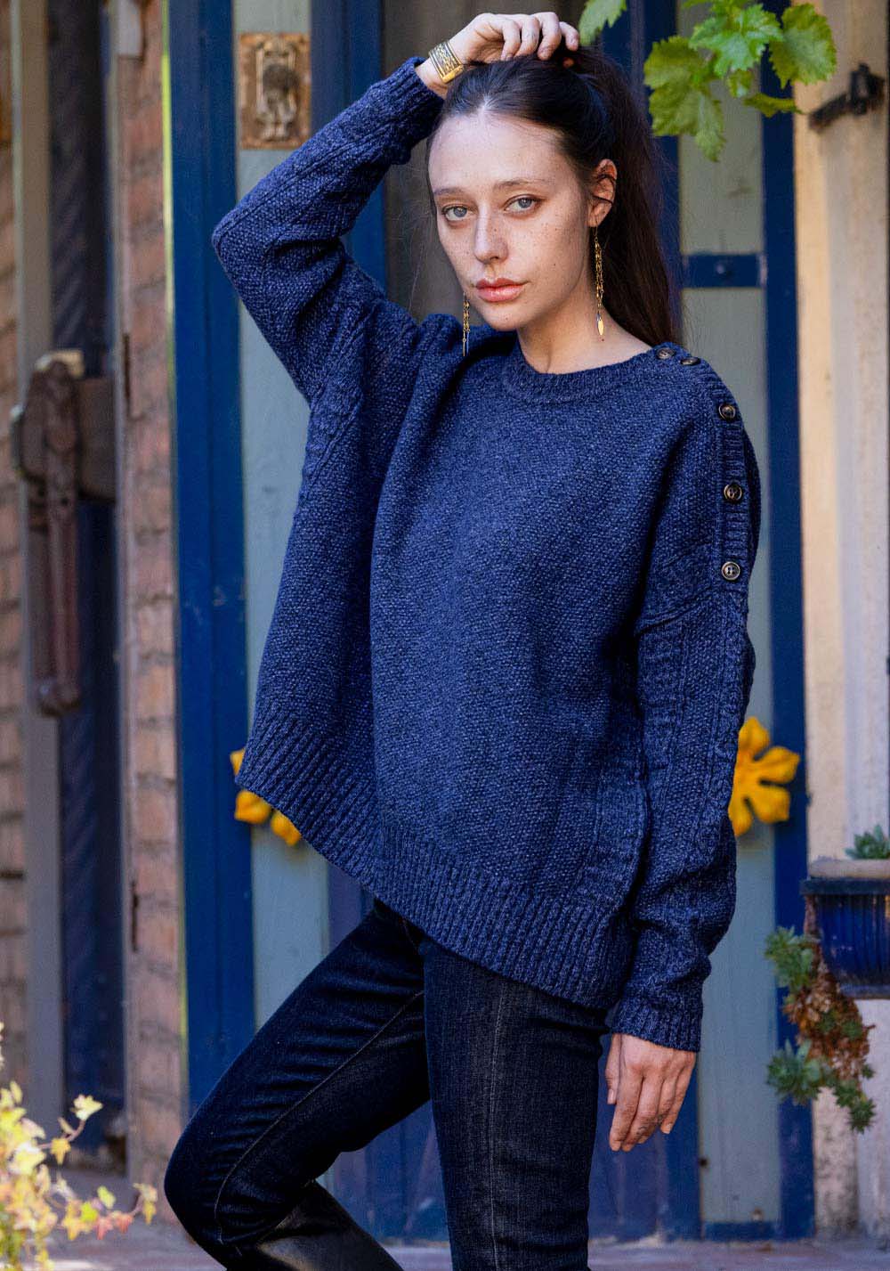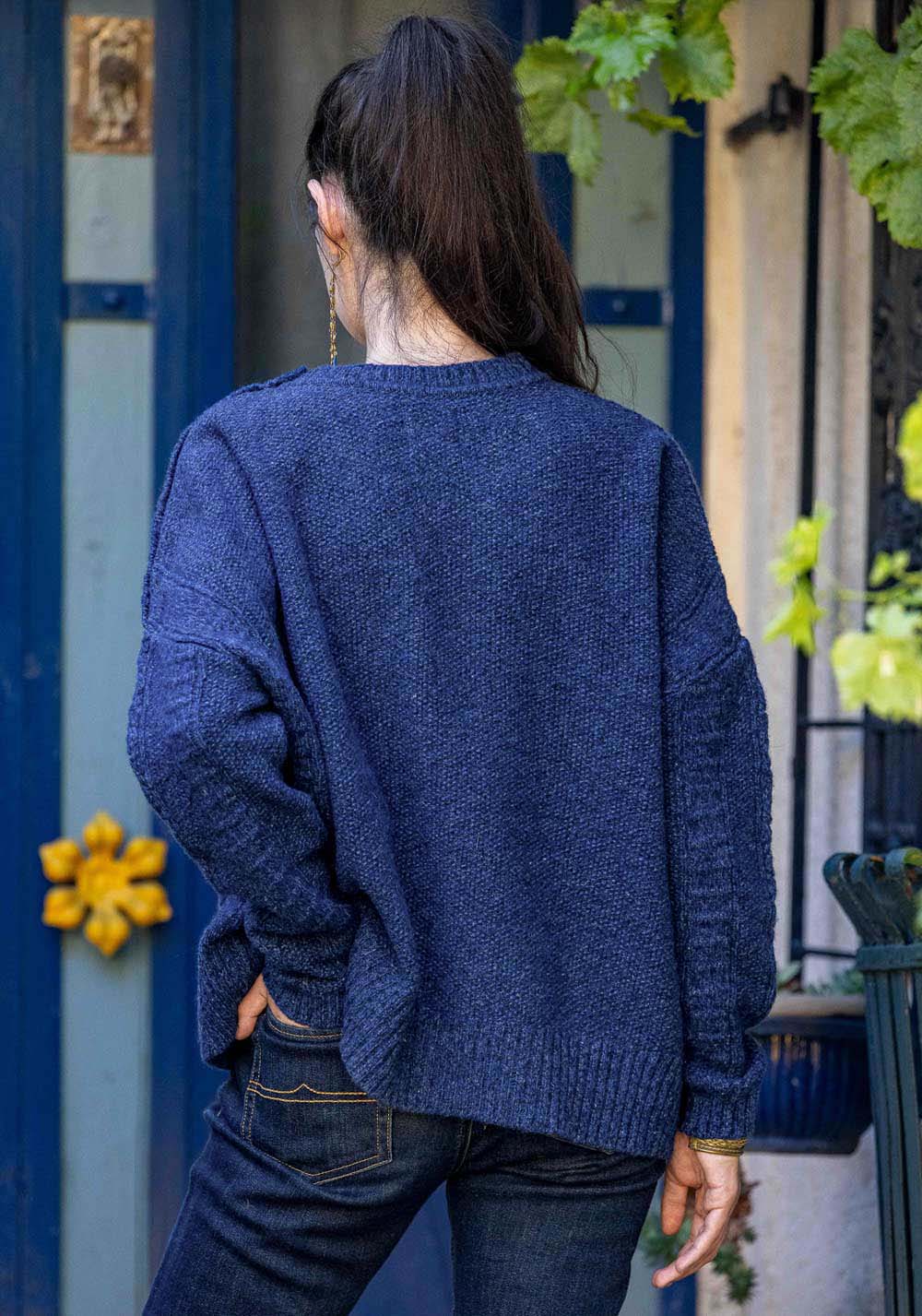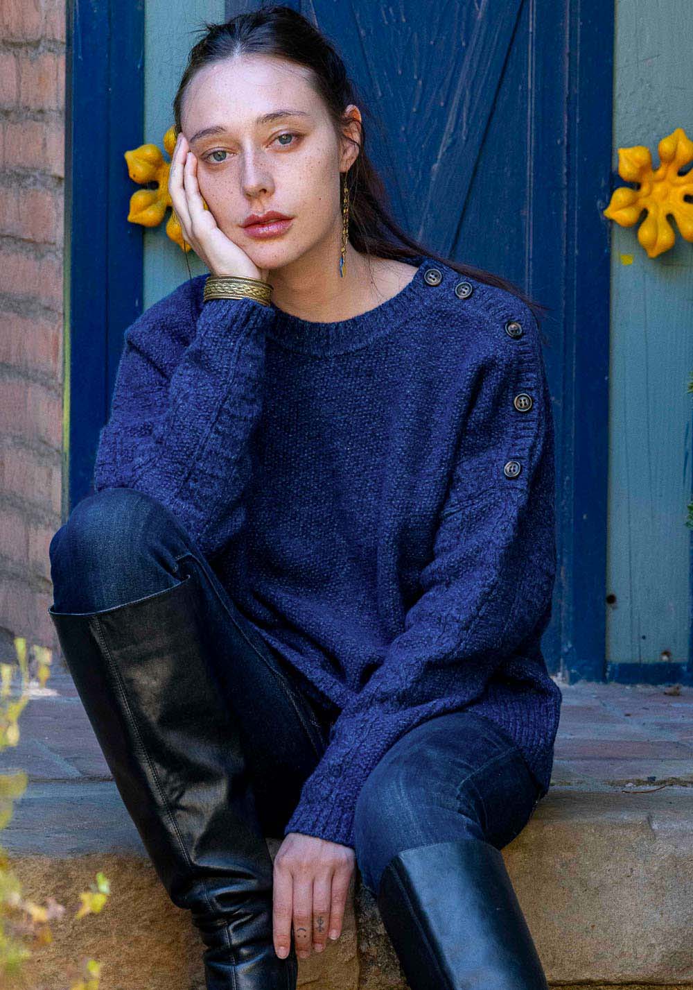 Tricoté en point de riz, le pull " QUAI BRANLY ", par sa carrure volontairement agrandie et ses manches fittées rehaussées de mailles fantaisies et de torsades en relief, propose une forme loose. Une animation discrète sur les cotés accompagne ses emmanchures basses. Sa patte de boutonnage fermée par des boutons en corozo offre la possibilité de dévoiler légèrement l’épaule pour une allure libre et décontractée.