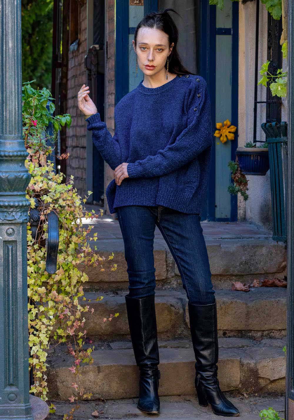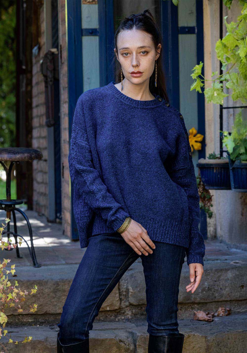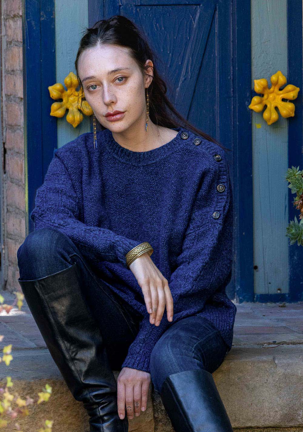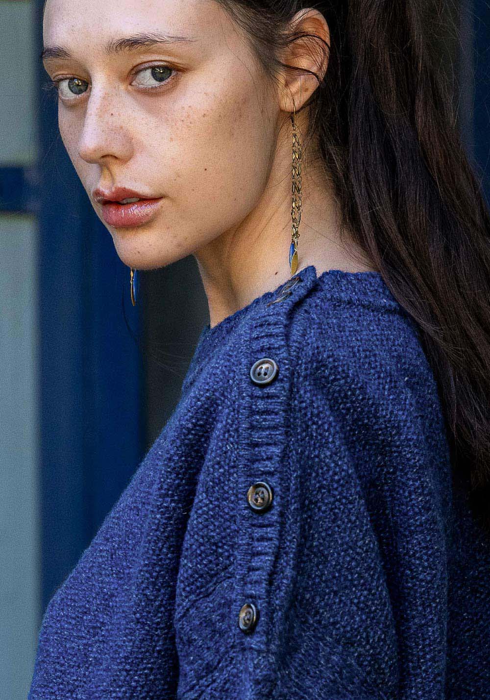 Tricoté en point de riz, le pull " QUAI BRANLY ", par sa carrure volontairement agrandie et ses manches fittées rehaussées de mailles fantaisies et de torsades en relief, propose une forme loose. Une animation discrète sur les cotés accompagne ses emmanchures basses. Sa patte de boutonnage fermée par des boutons en corozo offre la possibilité de dévoiler légèrement l’épaule pour une allure libre et décontractée.
