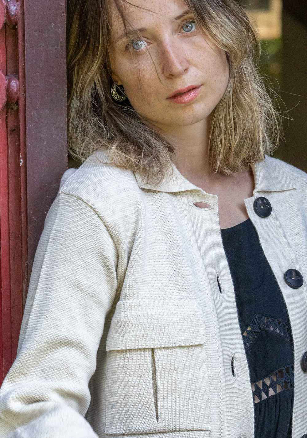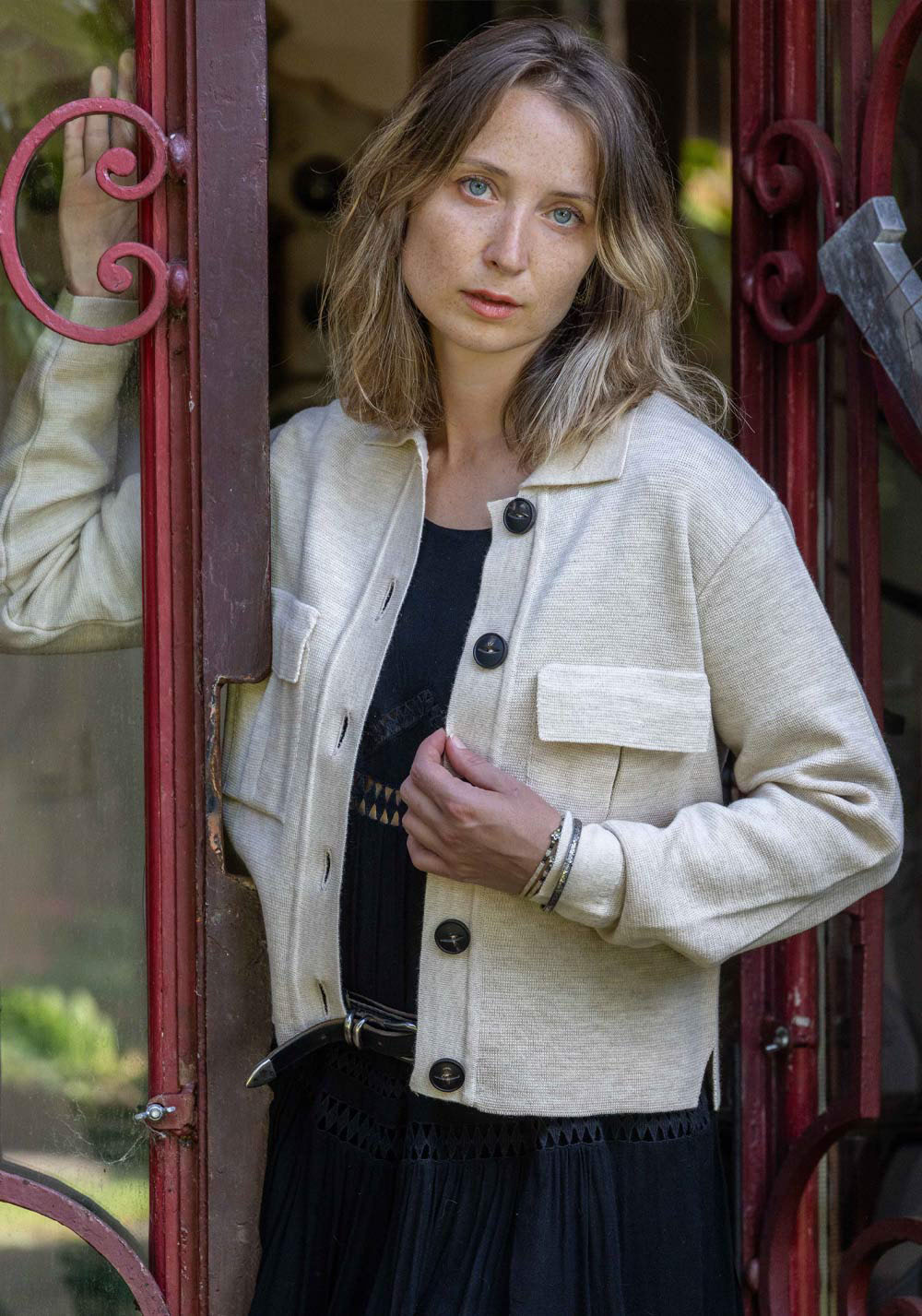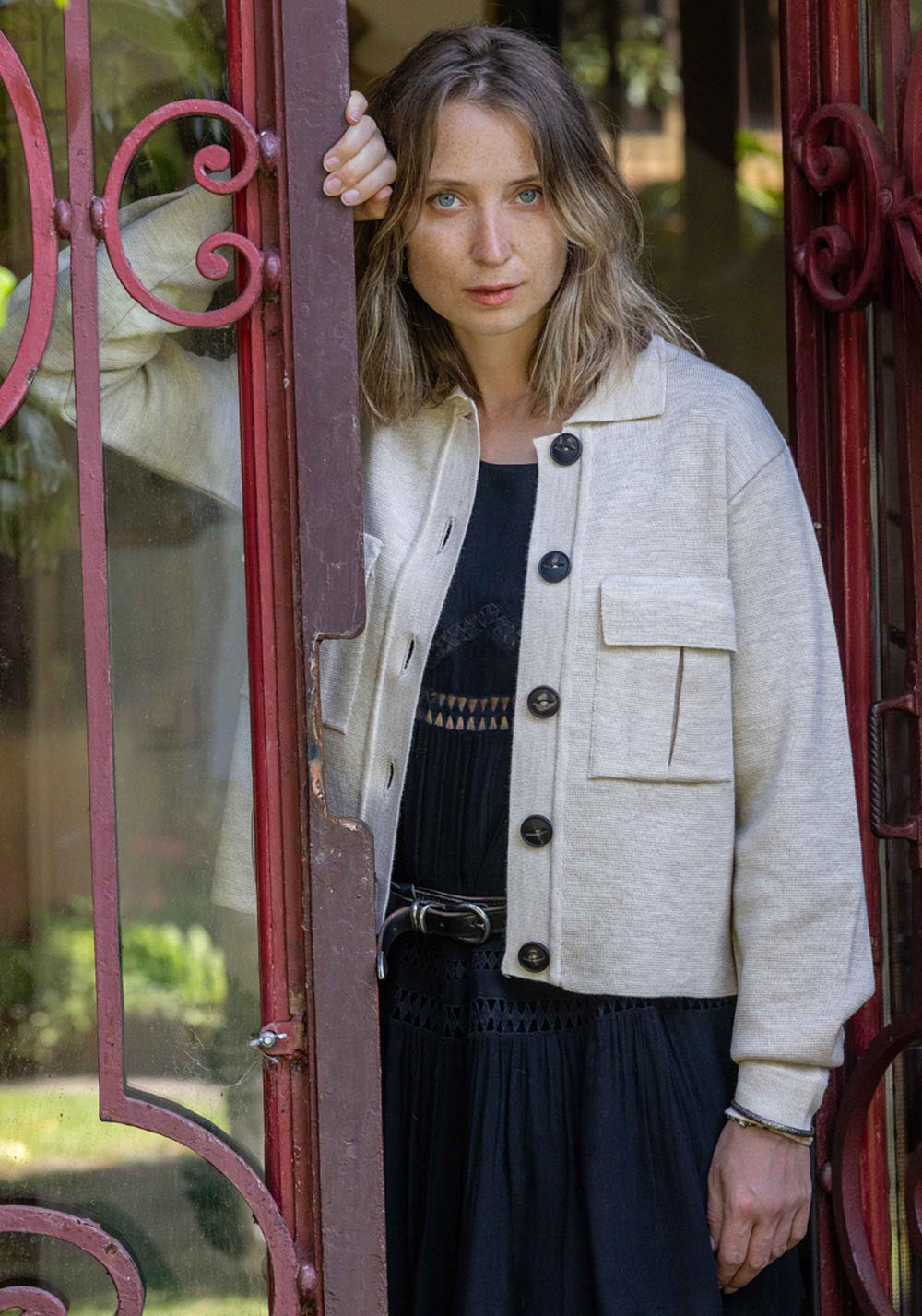 En écru chiné, combinez-la avec un jean clair ou une jupe en maille pour un rendu doux et lumineux.