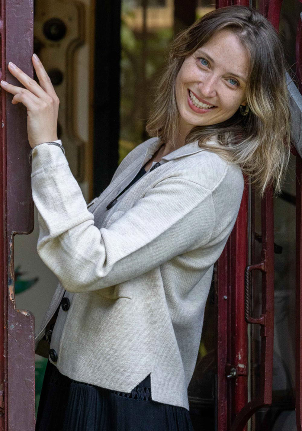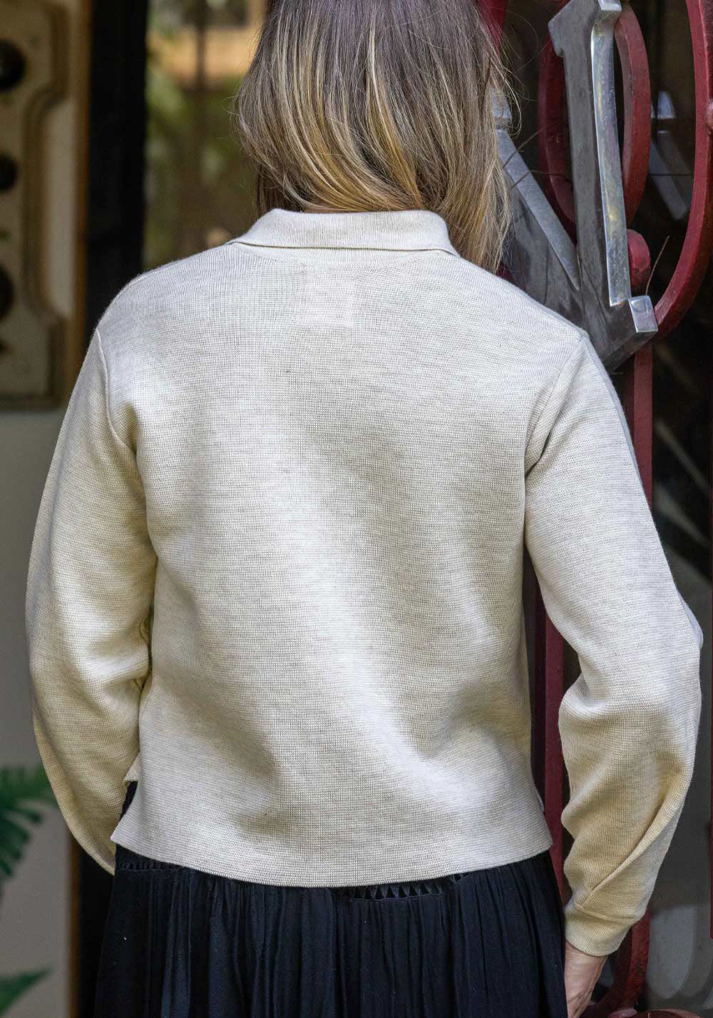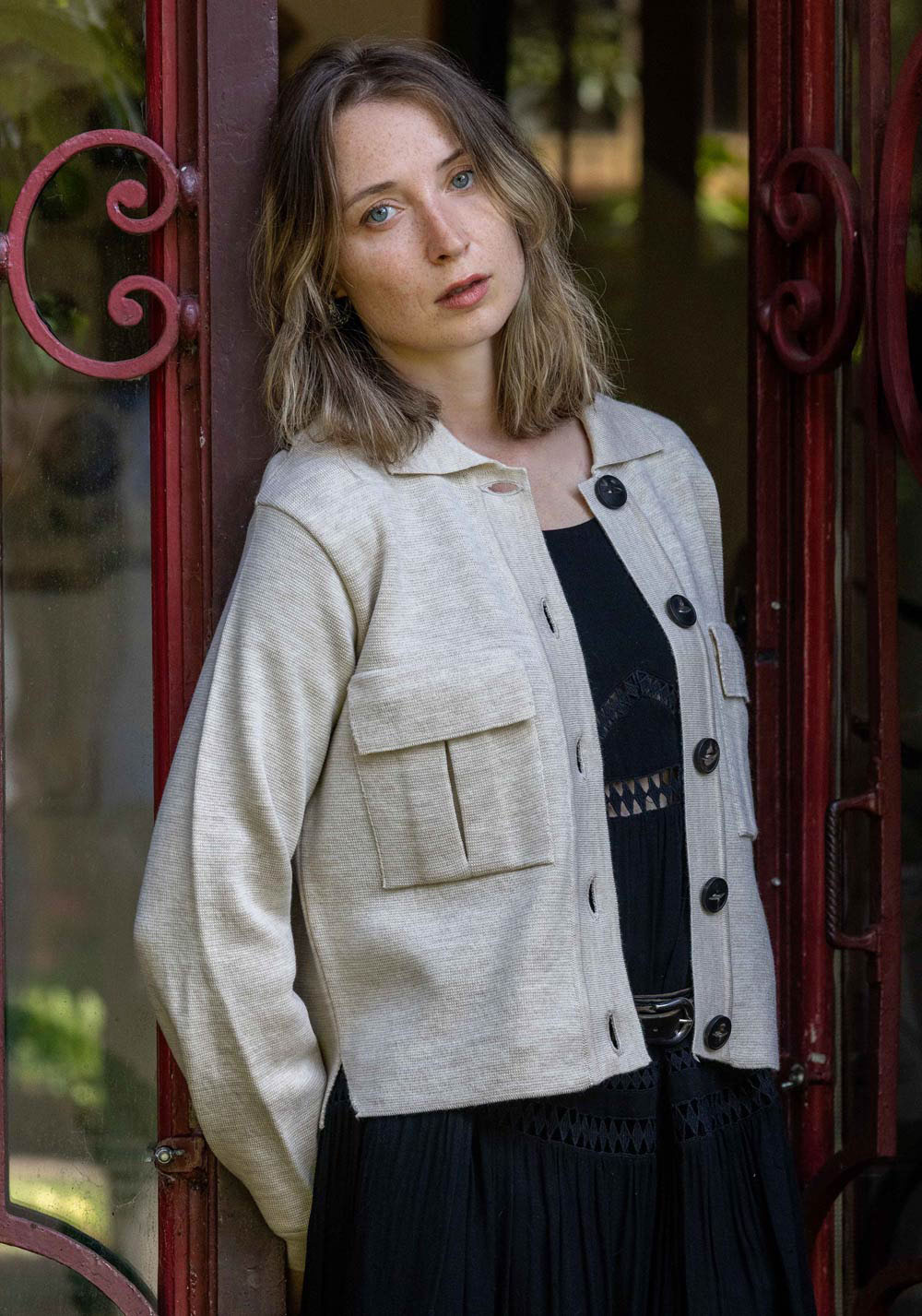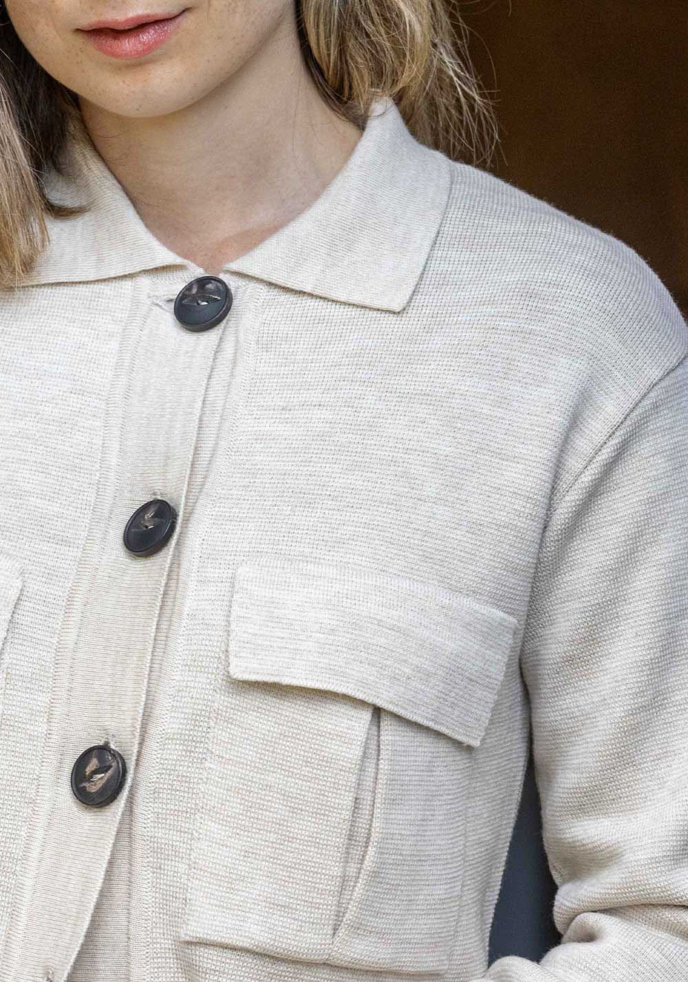 En écru chiné, combinez-la avec un jean clair ou une jupe en maille pour un rendu doux et lumineux.