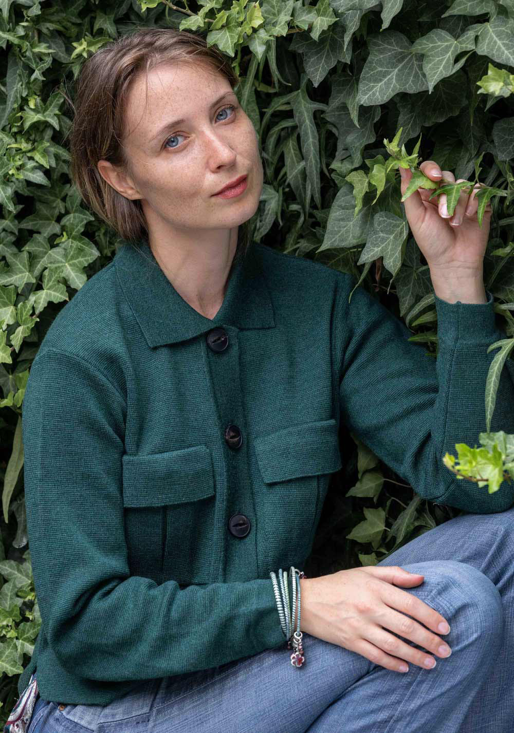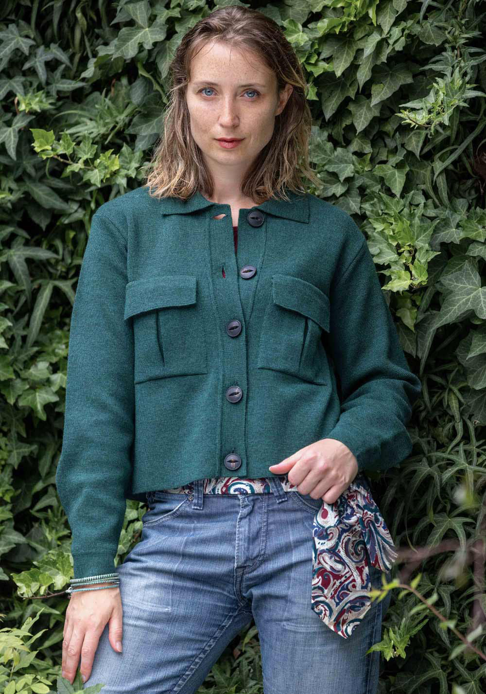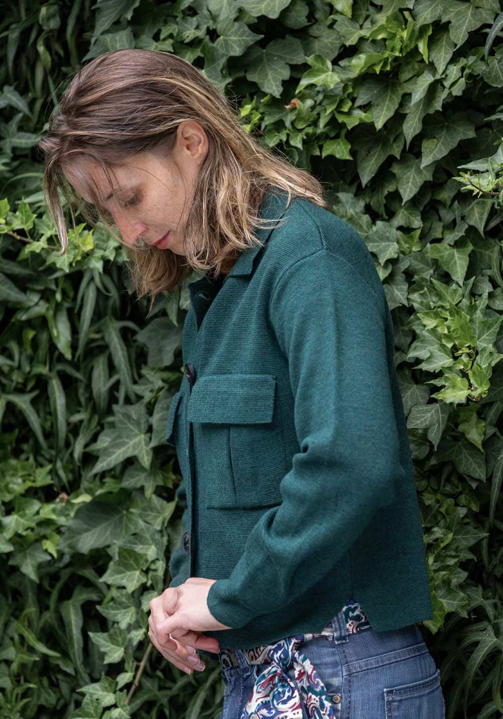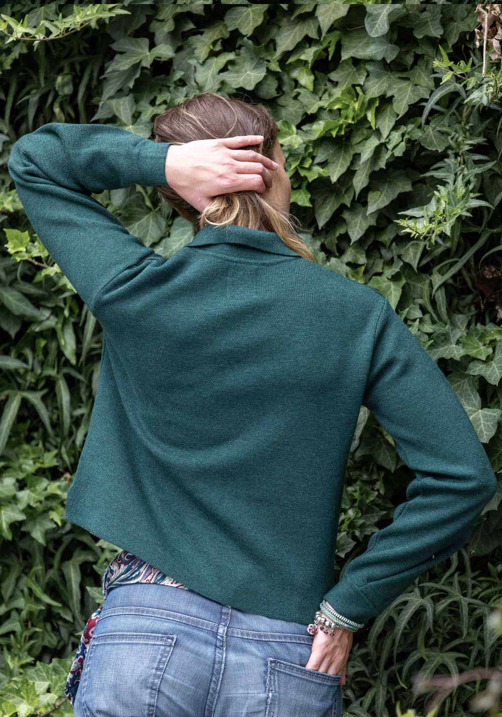 En vert sapin, associez-la à un jean droit taille-haute pour une allure naturelle et élégante.