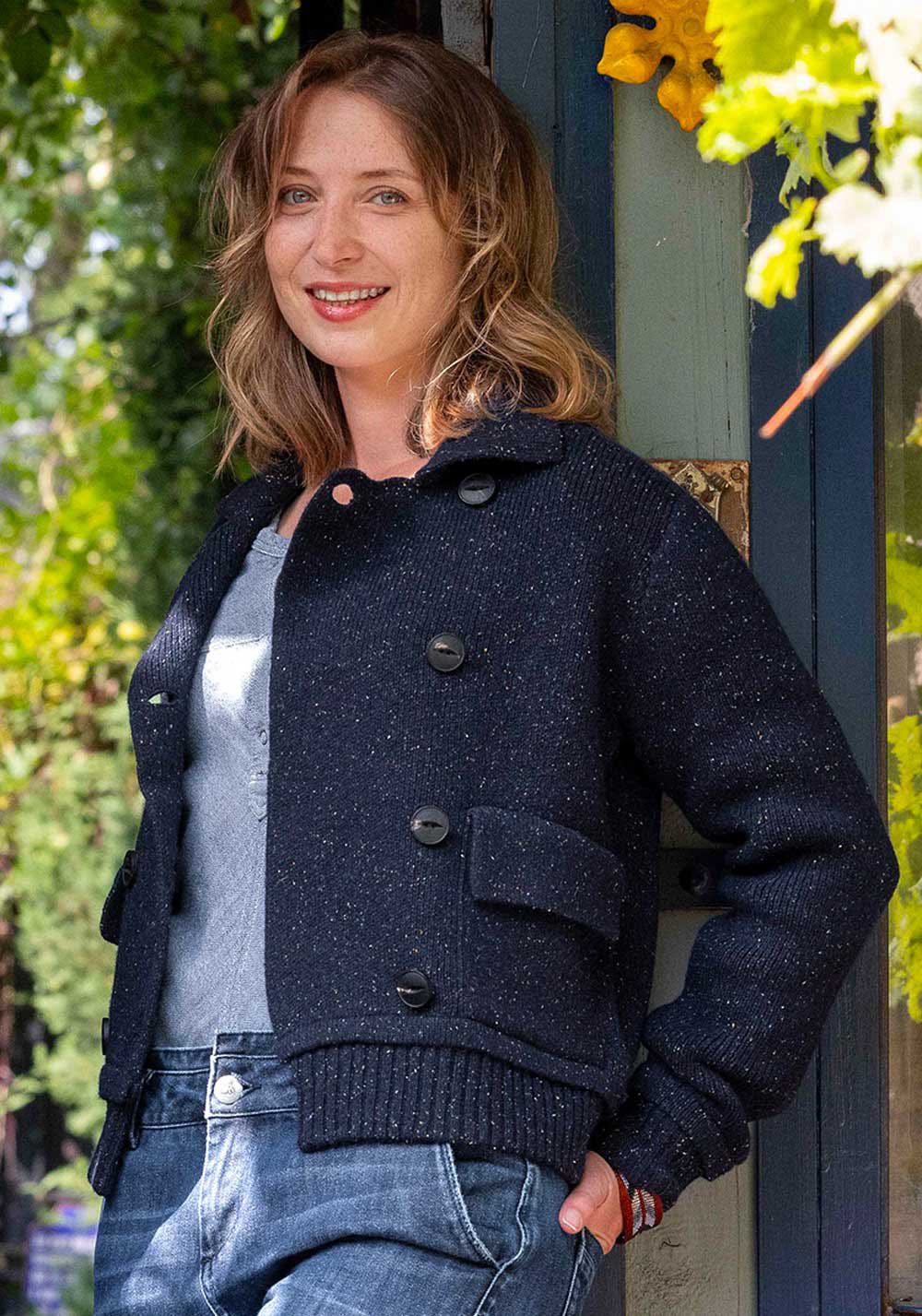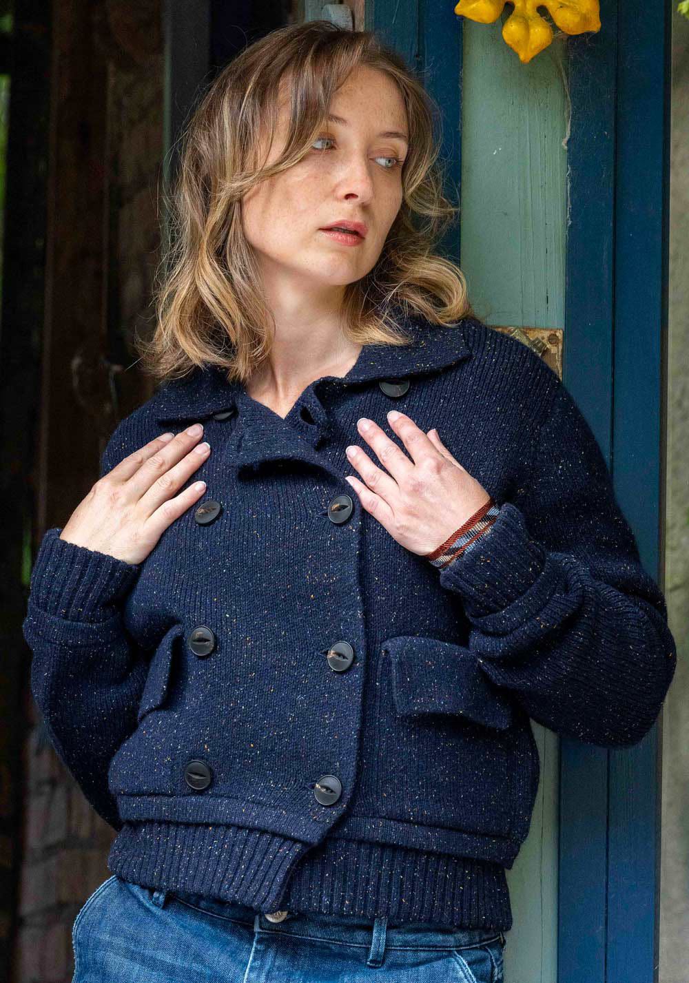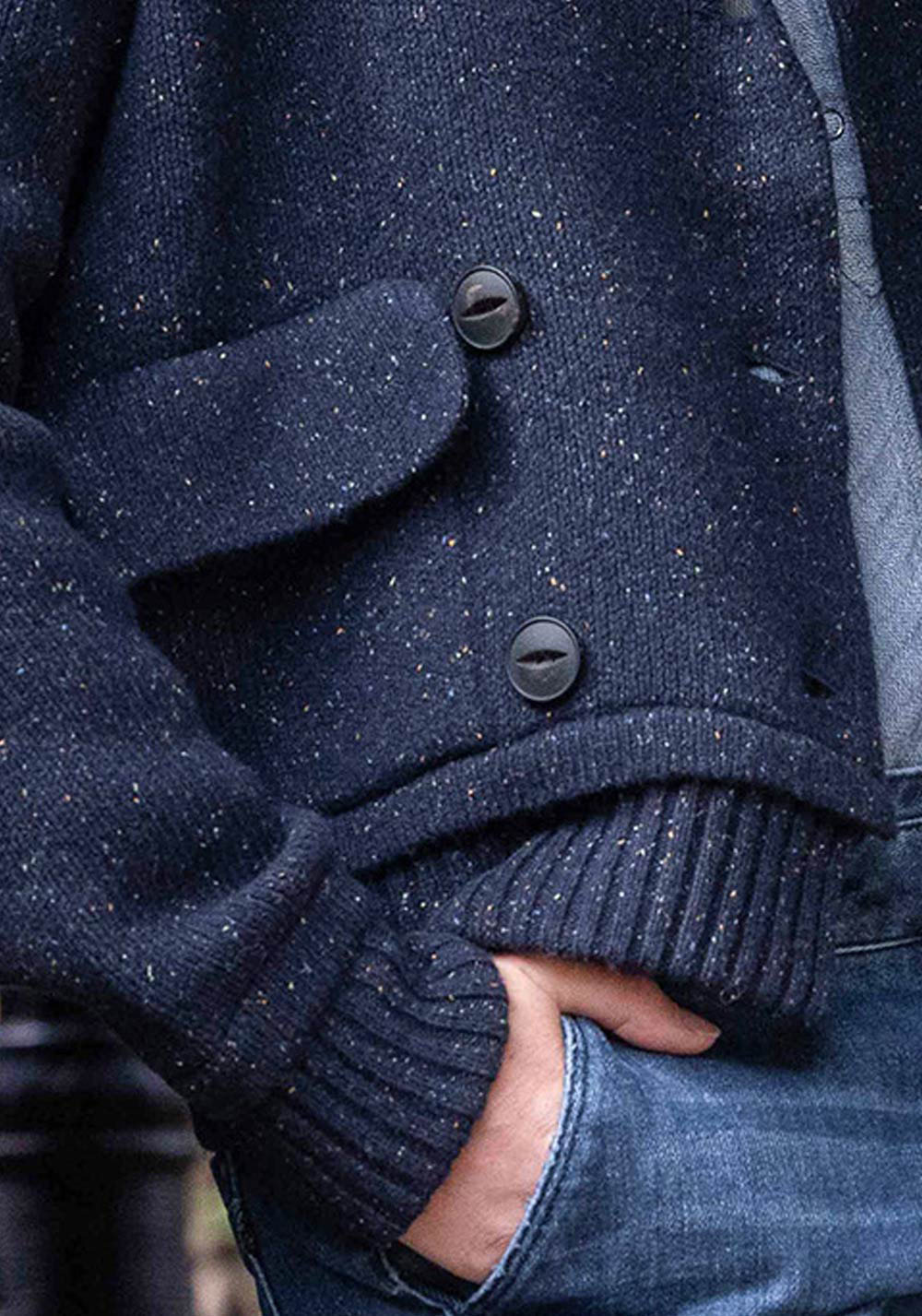 Inspiré du caban breton, la veste PETIT PALAIS est tricoté en maille Milano dans une laine rehaussée de bourrettes de soies colorées, le tout 100% recyclé.